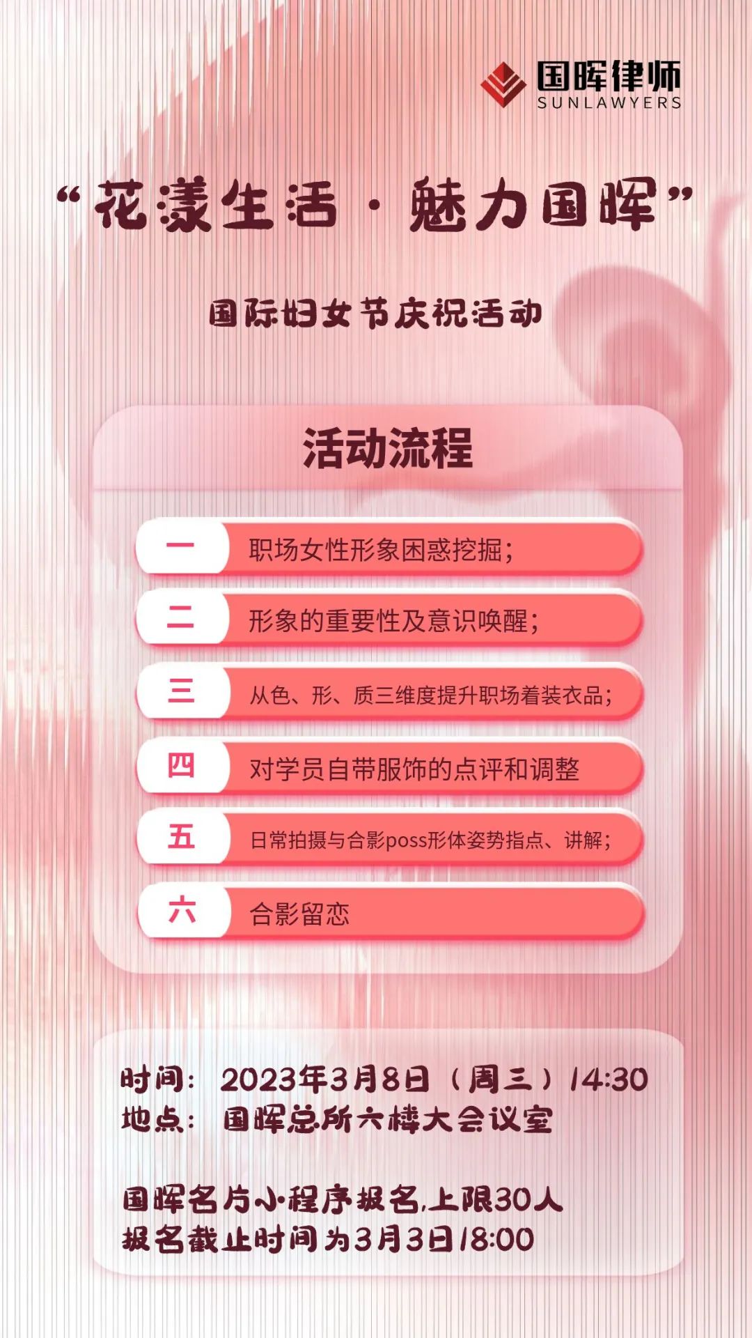 2023年3月8日下午,为迎接第113个国际劳动妇女节,体现国晖律所对女同胞的关爱,展现国晖女职工高雅风貌、陶冶情操,国晖律所开展“花漾生活·魅力国晖”文化庆祝活动。