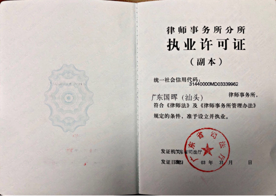 2023年3月23日,经司法行政部门审批,国晖律所全国第31家分所——汕头分所正式设立。