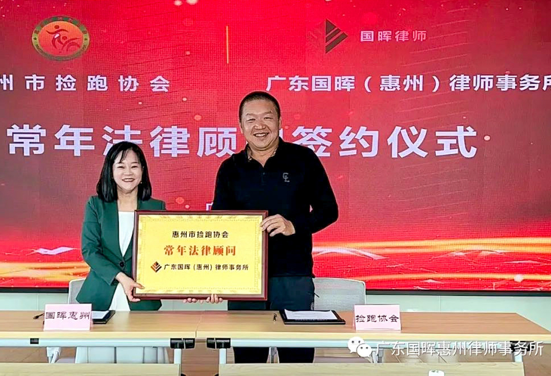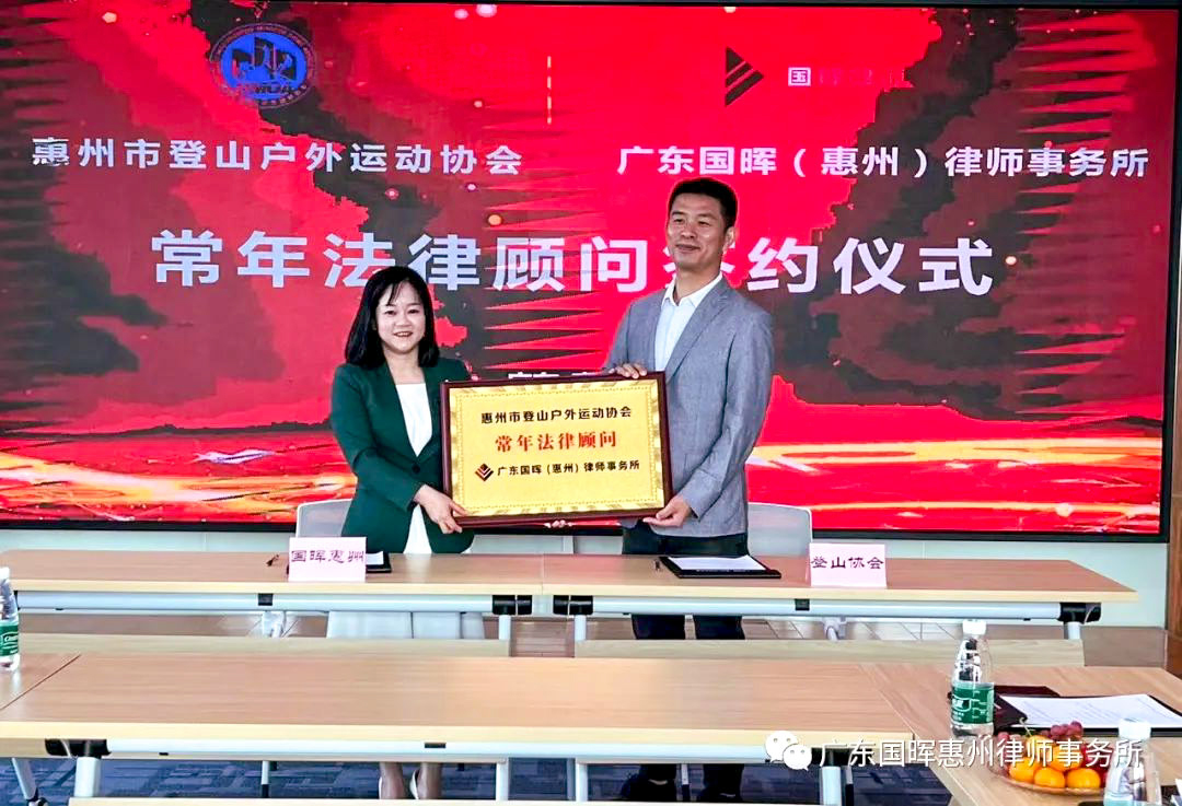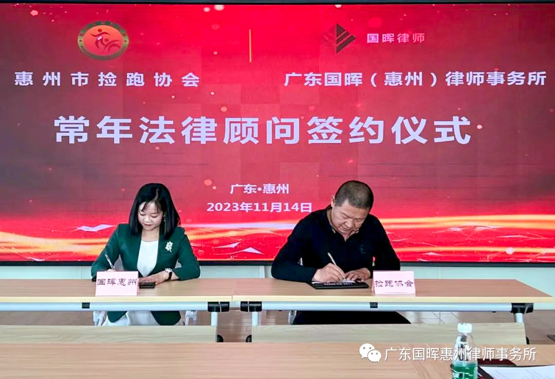 2023年11月14日,在秋风送爽的季节里,国晖(惠州)律师事务所携手惠州市登山户外运动协会、惠州市捡跑协会,在律所内举办了常年法律顾问签约仪式。