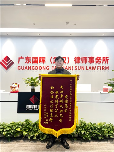 2023年11月15日,国晖(武汉)律师事务所收到一份特殊的快递,是一个印有“感谢您的专业卓越、尽职尽责,我获得了公正和合理的法律支持”的锦旗,这个锦旗是委托当事人陈女士寄至武汉分所,特别感谢李铭卓律师在为其代理的案件中尽心竭力,尽职尽责,并对 国晖(武汉)律师事务所律师的专业水平表示认可和赞扬。