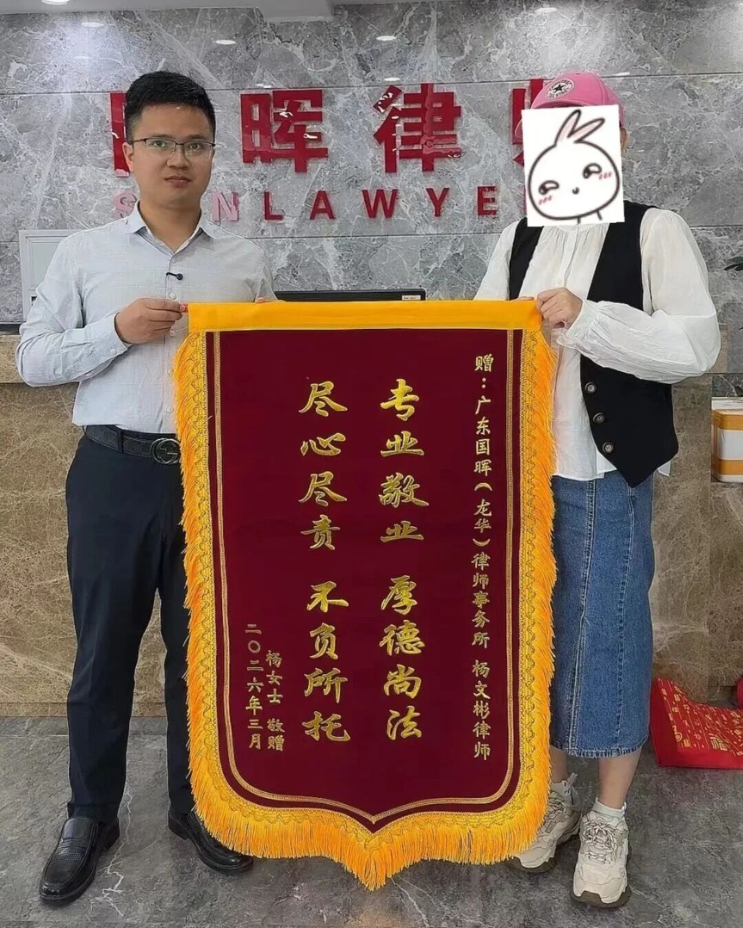 2026年3月26日,我所杨文彬律师收到了当事人杨女士专程来国晖龙华律师赠送“专业敬业、厚德尚法、尽心尽责、不负所托”锦旗,对其在案件代理中专业尽责与诚挚服务致以真心感谢,并高度赞杨杨律师的专业水准。