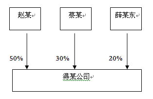 得某公司于2015年4月27日取得《营业执照》,其注册资本为人民币1000万元,蔡某认缴出资额为300万元,出资比例为30%;赵某认缴出资额为500万元,出资比例为50%;薛某东认缴出资比例为20万元,出资比例为20%。经营范围为“投资管理、投资咨询(不得从事信托、金融资产管理、证券资产管理等业务);信息咨询;国内贸易;经营进出口业务。”。执行董事和法定代表人赵某,监事薛某东。