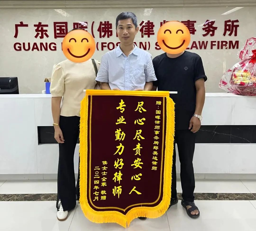 案件委托当事人侯女士一家专程为代理其案件的郑英达律师送来印有“尽心尽责安心人 专业勤力好律师”的精美锦旗一面,以感谢郑英达律师在为其案件代理的过程中以“专业、尽心、勤勉”的工作理念帮助其圆满解决了法律纠纷,坚定维护了当事人的合法权益,彰显了法律的公平正义。