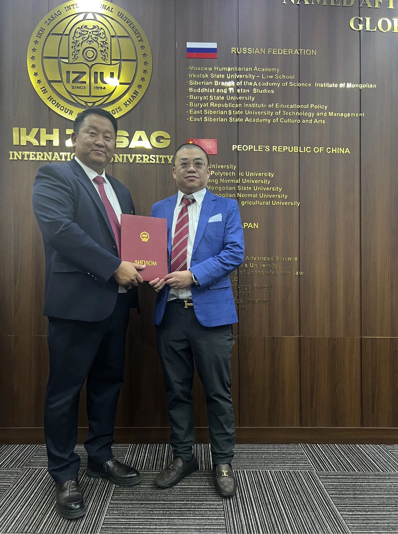 2024年10月2日,我所行政法专业委员会主任林波律师在蒙古国乌兰巴托市荣获蒙古大札撒国际大学(Ikh Zasag International University)授予的荣誉法学博士学位。