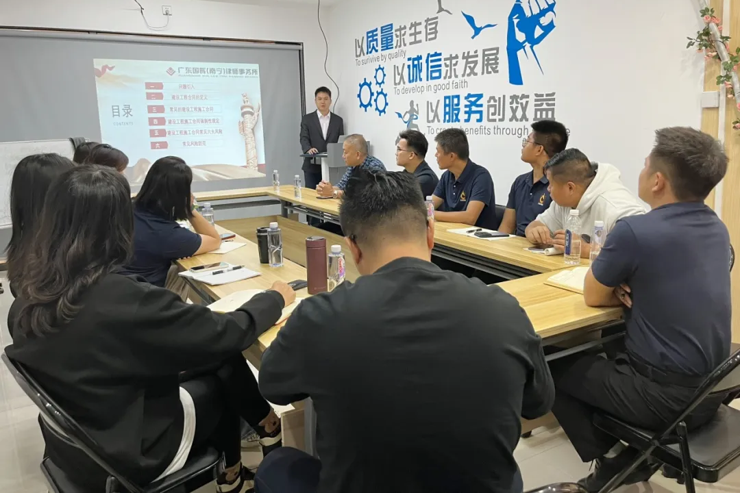 2024年10月28日,国晖(南宁)律师事务所吴震律师团队走进广西绿舒体育集团有限公司,为顾问单位提供了一场主题为《常见建设工程合同风险及管理》的专业法律培训。